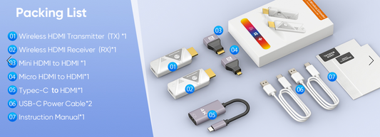 • Image of Sonecess wireless HDMI transmitter and receiver extender Kit with 4K resolution, including three accessories: USB-C to HDMI 4k adapter, Micro HDMI 8K adapter, and Mini HDMI 8K adapter, offering versatile connectivity for various devices.